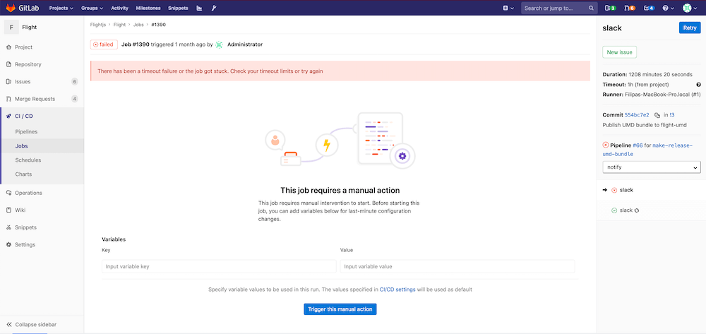 You can do this from the job page of the manual job you want to run with additional variables. To access this page, click on the name of the manual job in the pipeline view, not the play ({play}) button.