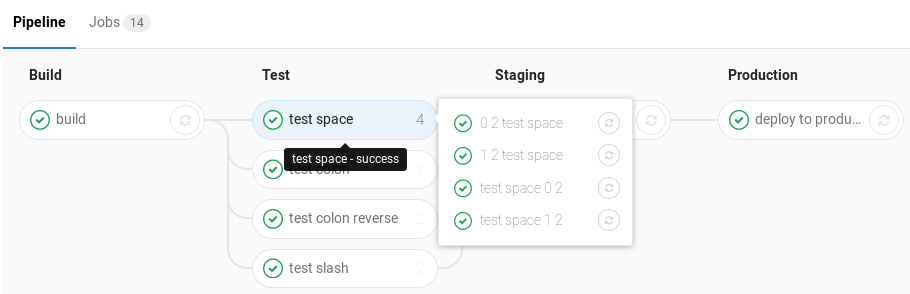 You can recognize when a pipeline has grouped jobs if you don't see the retry or cancel button inside them. Hovering over them shows the number of grouped jobs. Click to expand them.