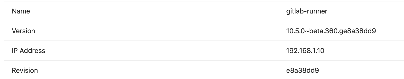 Attribute Description Type One or more of the following states: shared, group, specific, locked, or paused Runner token Token used to identify the runner, and that the runner uses to communicate with the GitLab instance Description Description given to the runner when it was created Version GitLab Runner version IP address IP address of the host on which the runner is registered Projects The count of projects to which the runner is assigned Jobs Total of jobs run by the runner Tags Tags associated with the runner Last contact Timestamp indicating when the GitLab instance last contacted the runner