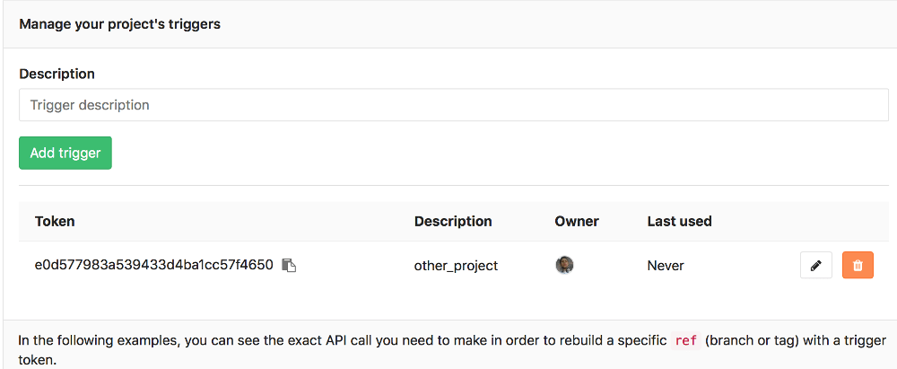 - curl --request POST --form "token=$CI_JOB_TOKEN" --form ref=master "https://gitlab.example.com/api/v4/projects/9/trigger/pipeline"