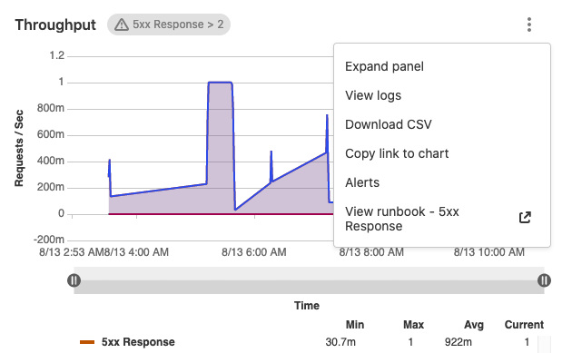You can take action related to a chart's data by clicking the {ellipsis_v} More actions dropdown box above the upper right corner of any chart on a dashboard: