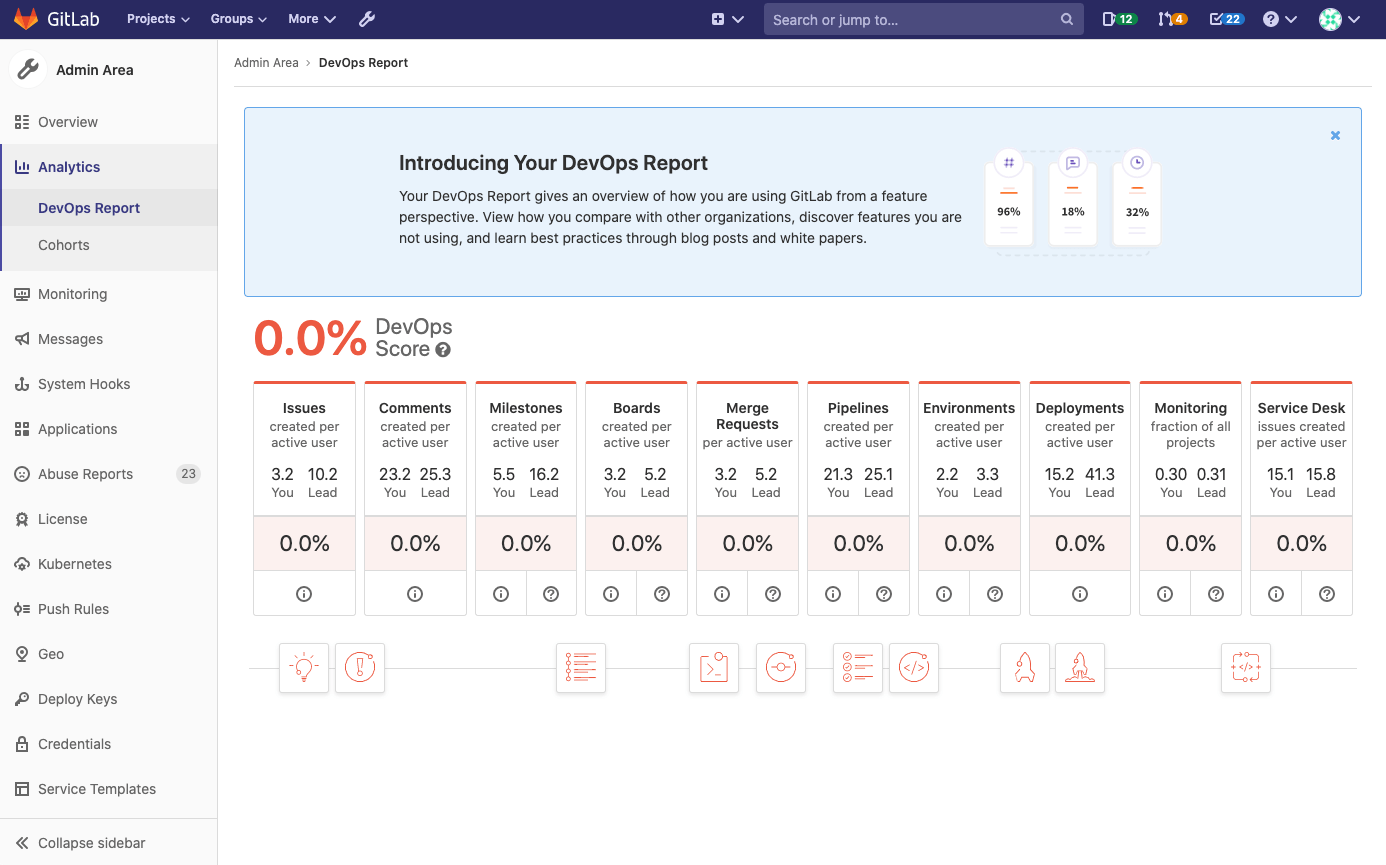The DevOps Score tab displays the usage of major GitLab features on your instance over the last 30 days, averaged over the number of billable users in that time period. It also provides a Lead score per feature, which is calculated based on GitLab analysis of top-performing instances based on usage ping data that GitLab has collected. Your score is compared to the lead score of each feature and then expressed as a percentage at the bottom of said feature. Your overall DevOps Score is an average of your feature scores. You can use this score to compare your DevOps status to other organizations.