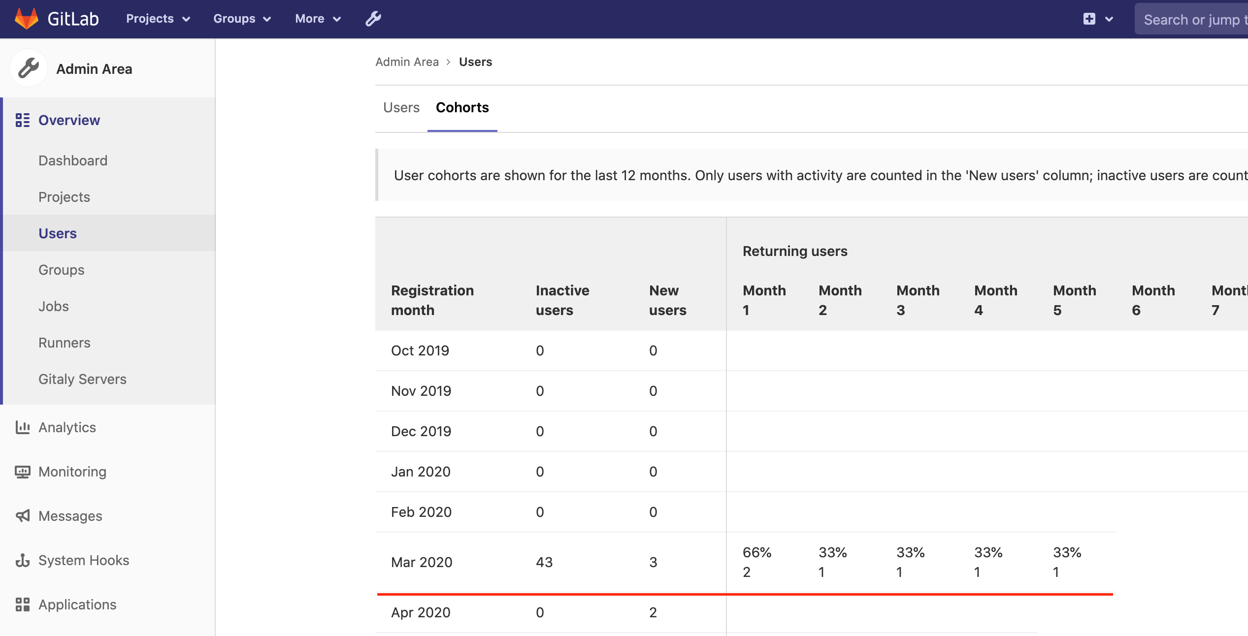 For the cohort of March 2020, three users were added to this server and have been active since this month. One month later (April 2020), two users are still active. Five months later (August 2020), one user from this cohort is still active, or 33% of the original cohort of three that joined in March.