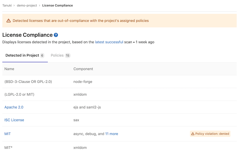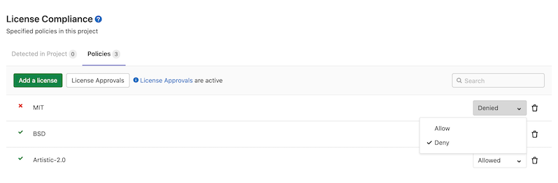 Policies allow you to specify licenses that are allowed or denied in a project. If a denied