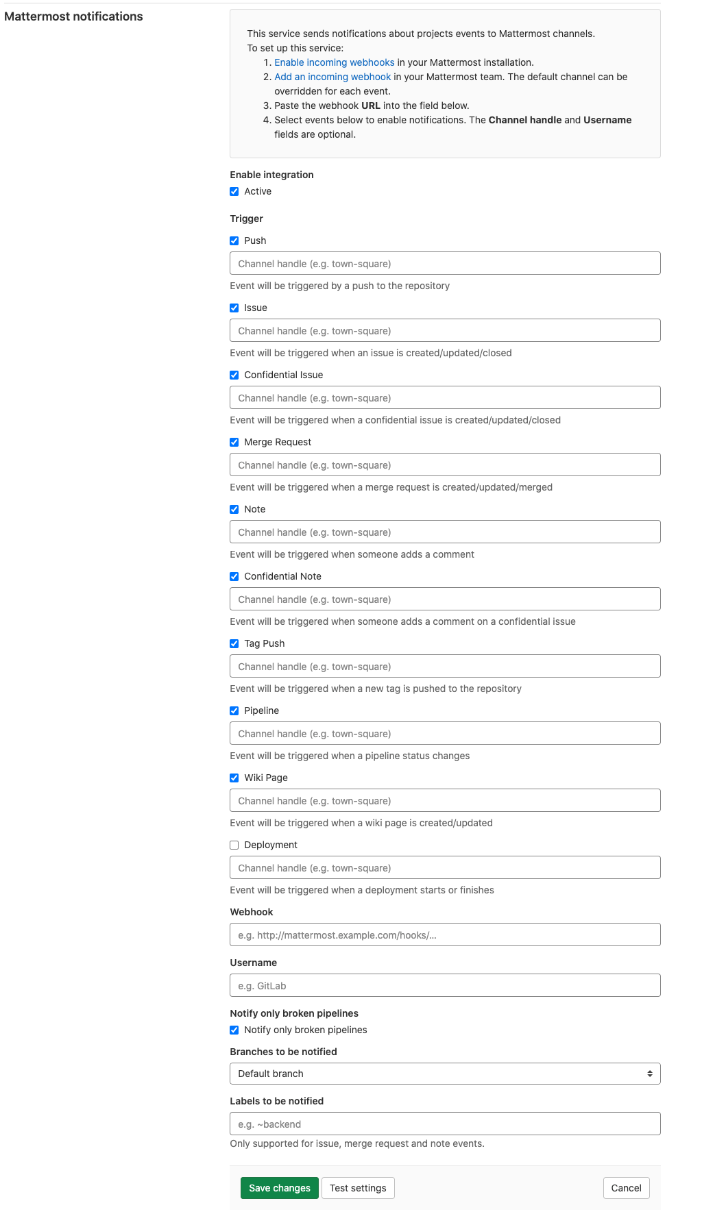 https://mattermost.example.com/your_team_name/integrations/incoming_webhooks/add. - Choose a display name, description and channel, those can be overridden on GitLab.