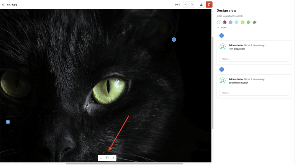 Introduced in GitLab Premium 12.8, you can adjust a pin's position by dragging it around the image. This is useful for when your design layout has changed between revisions, or if you need to move an existing pin to add a new one in its place.