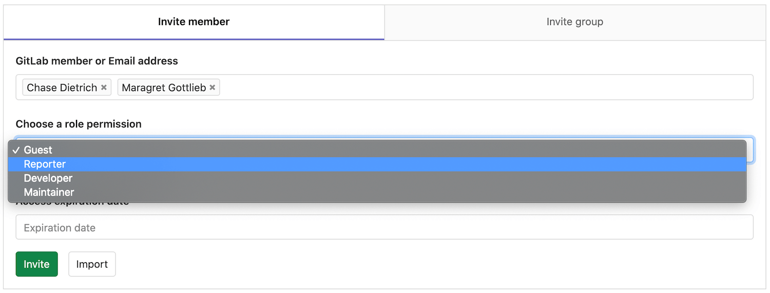 Select the one you want and hit Import project members. A flash message displays, notifying you that the import was successful, and the new members are now in the project's members list. Notice that the permissions that they had on the project you imported from are retained.