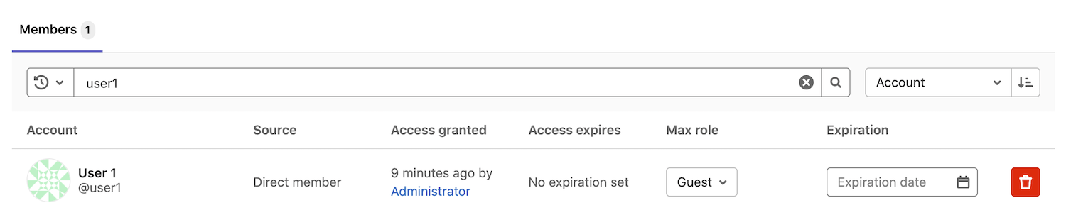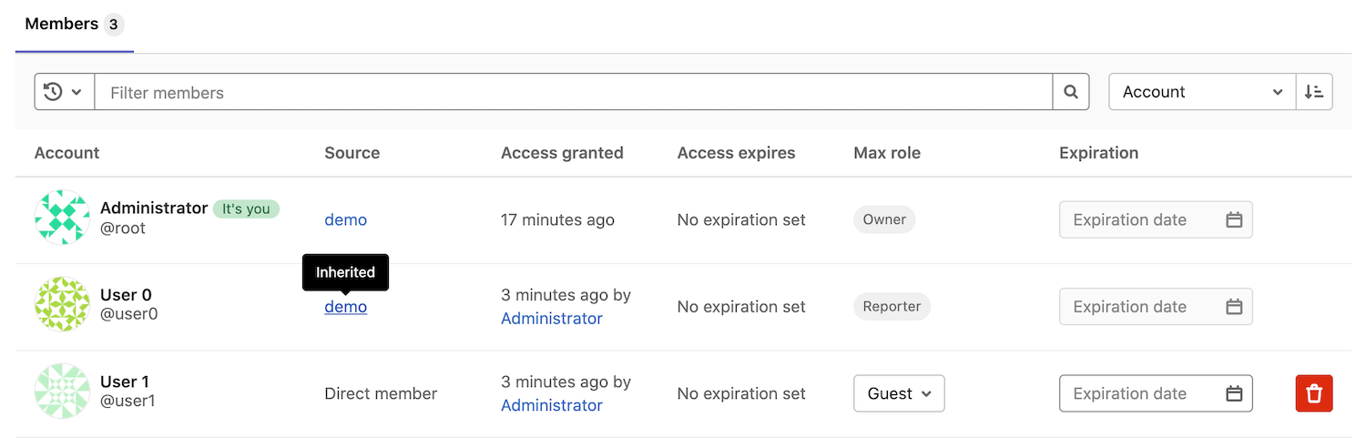 demowhich contains current project. - User1 is shown as a Direct member in the Source column, therefore they belong directly to the project we're inspecting.