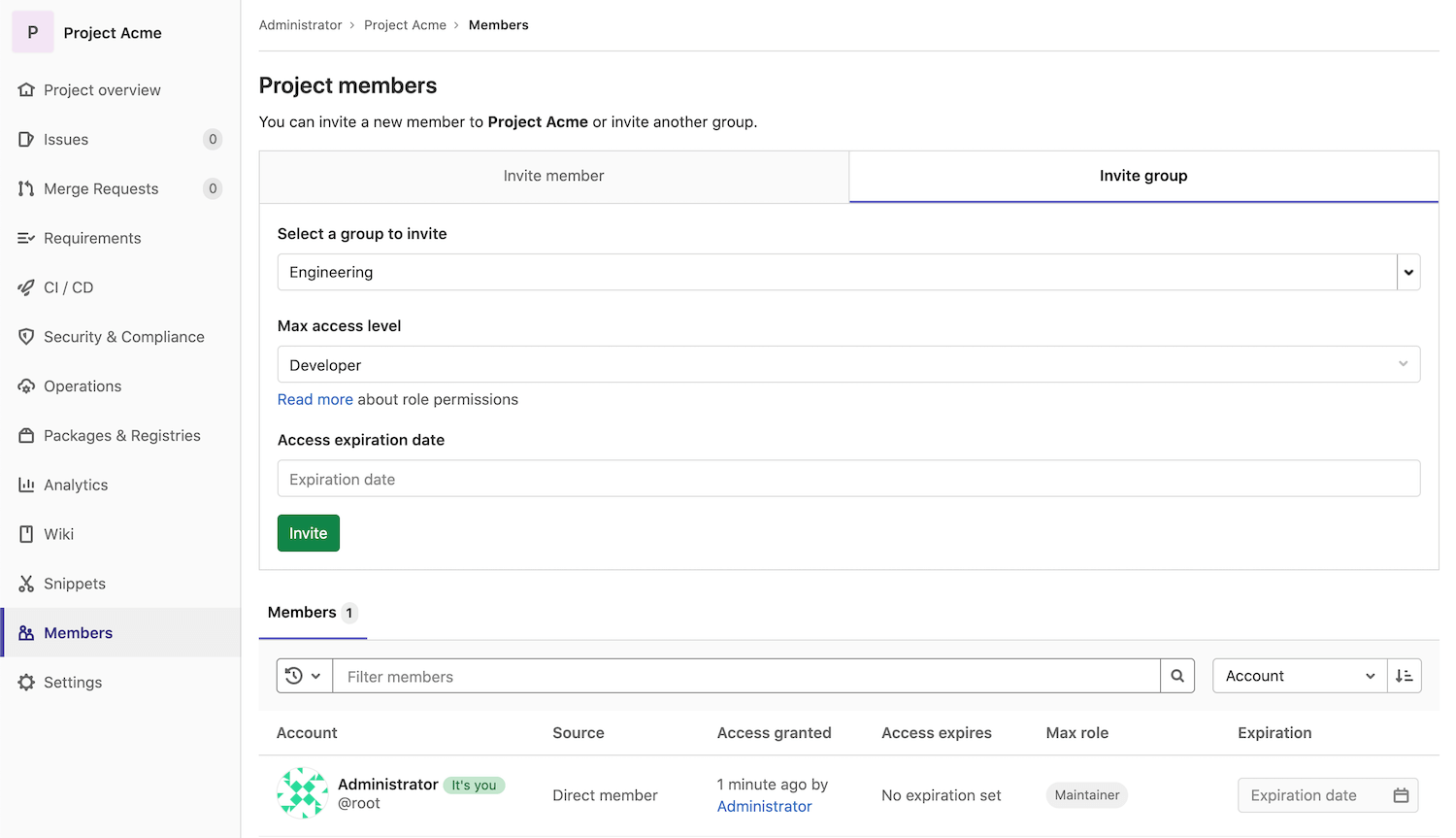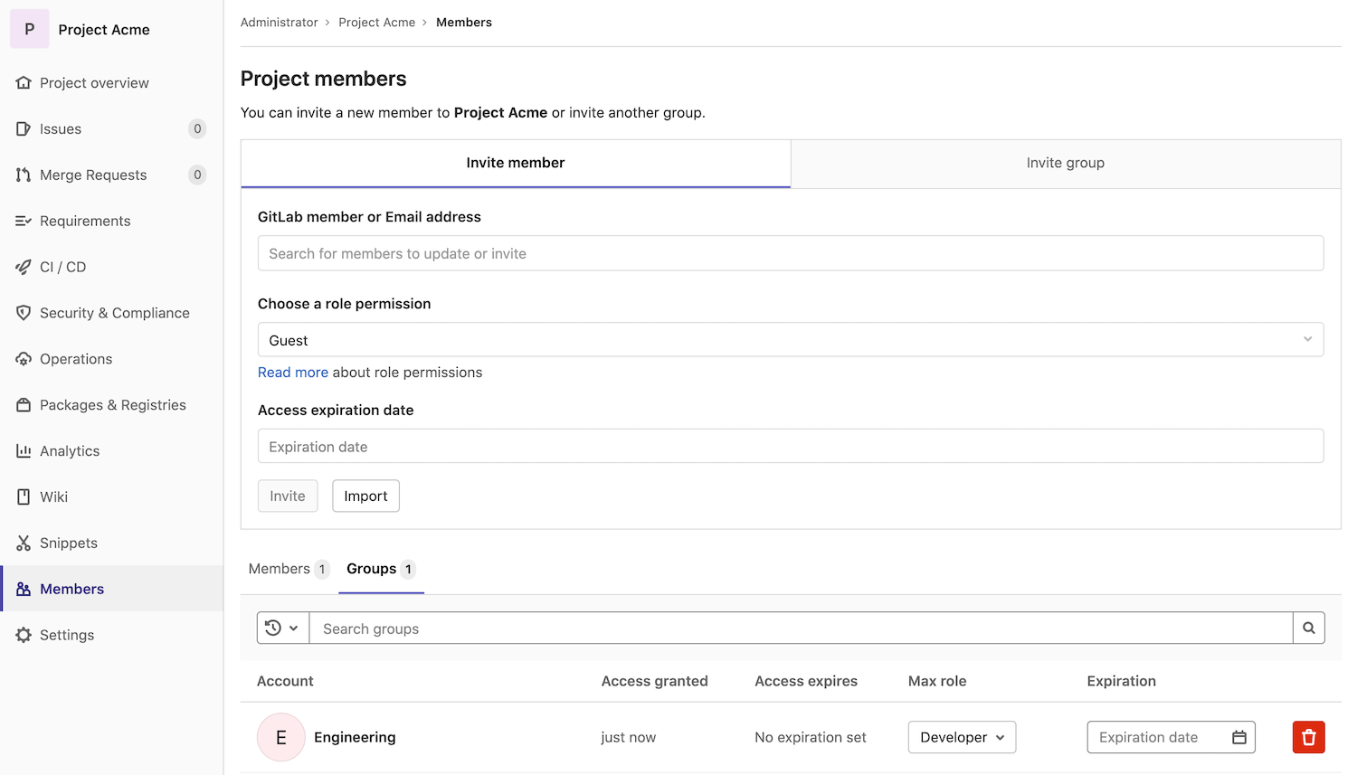 In the example above, the maximum access level of 'Developer' for members from 'Engineering' means that users with higher access levels in 'Engineering' ('Maintainer' or 'Owner') only have 'Developer' access to 'Project Acme'.