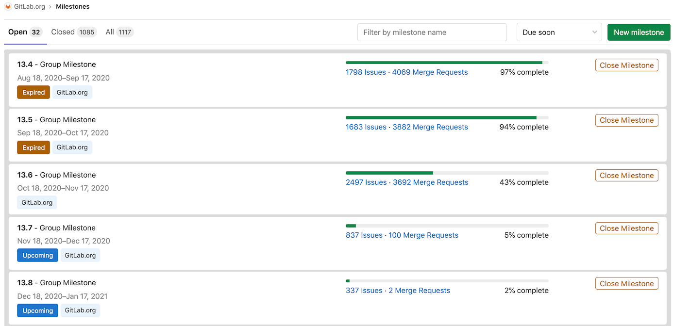 - Upcoming: Show issues or merge requests that have been assigned the open milestone and has the nearest due date in the future.